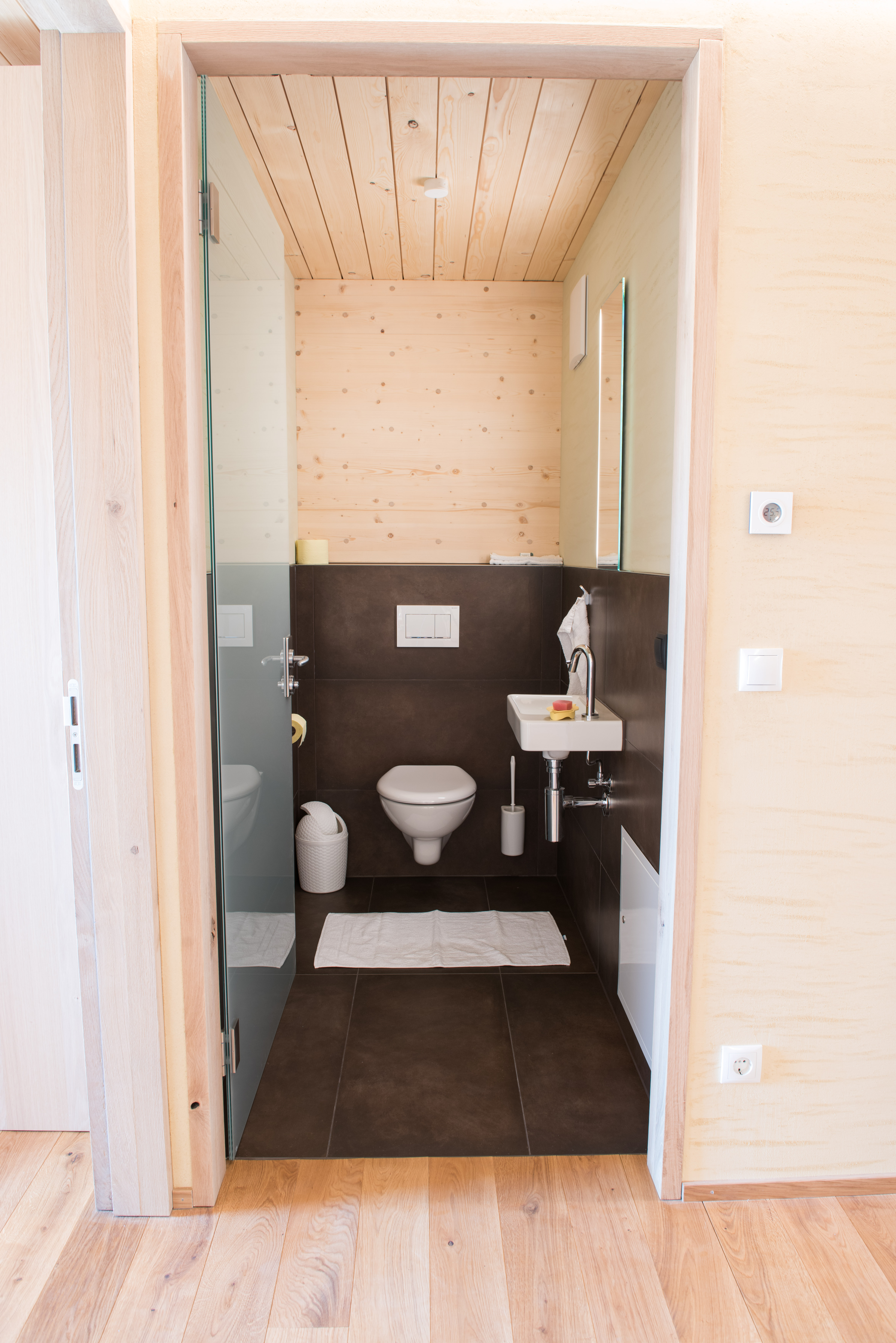 Unsere sanitären Einrichtungen sind eine kleine Wohlfühloase. Auch hier wurden nur biologische Baustoffe verarbeitet. Die Wände, die Böden und die Decken bestehen aus Lehm, Holz und Stein!