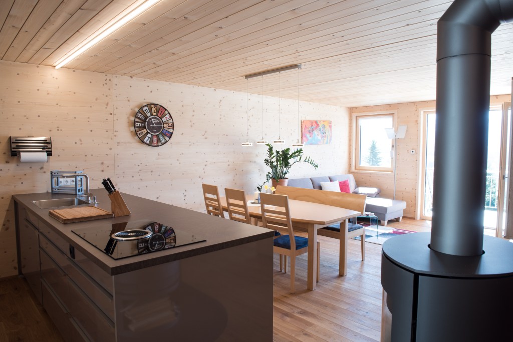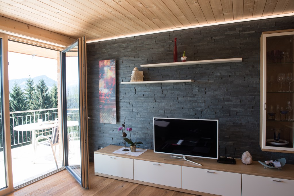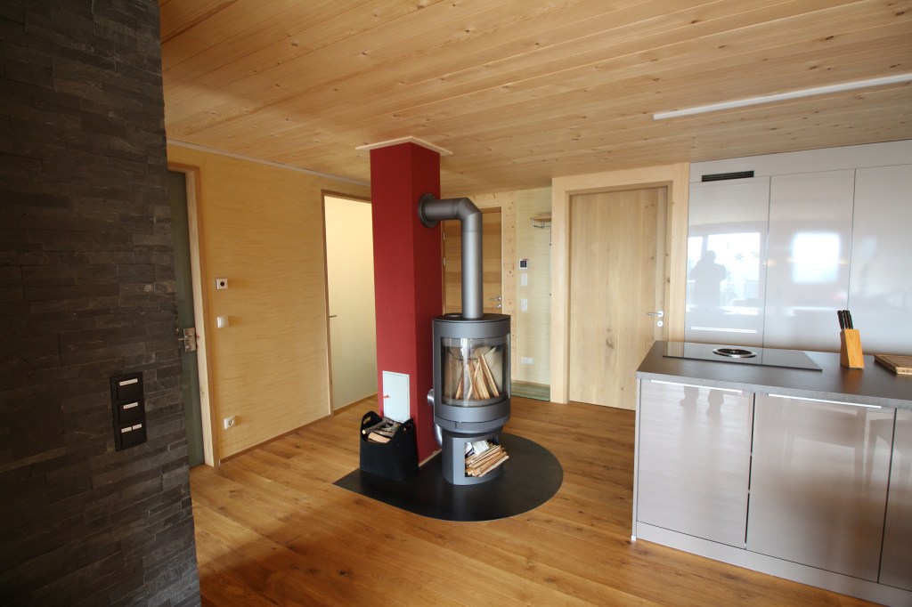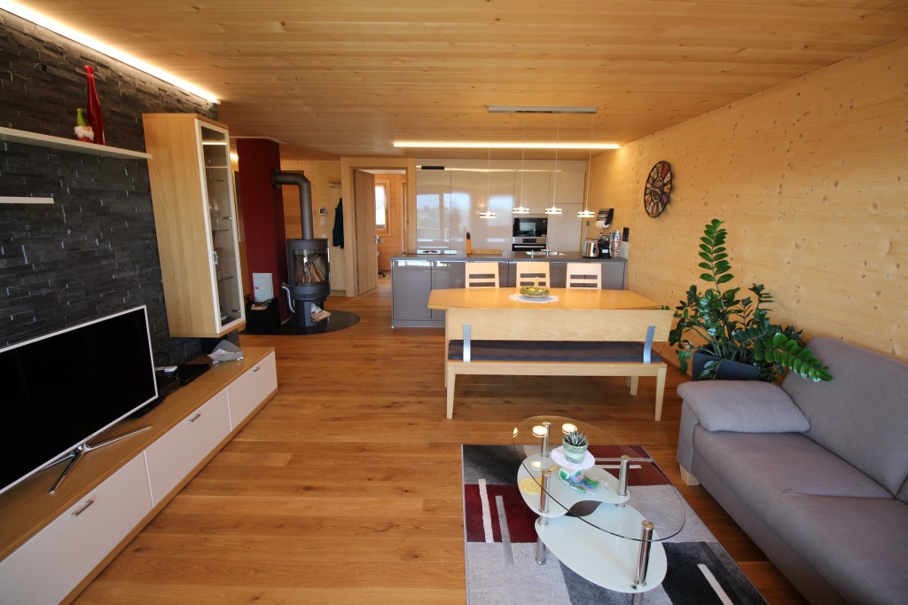 In unserem großräumigen Wohnzimmer ist der Wohlfühleffekt garantiert. Der Dielenboden aus Eiche und die Wände aus Vollholz und Lehm geben dem Raum ein einzigartiges Raumklima. Das Highlight stellt aber sicher unser Schwedenofen dar, der für all unsere Gäste zur Verfügung steht und für so manchen romantischen Abend sorgt. Die Fernsehwand besteht aus schwarzem Schiefer und rundet mit einer gemütlichen Eck-Couch das Ambiente ab. Ebenfalls gibt es einen direkten Zugang zum Balkon. Der gesamte Bereich wird über eine regulierbare Infrarotheizung beheizt.